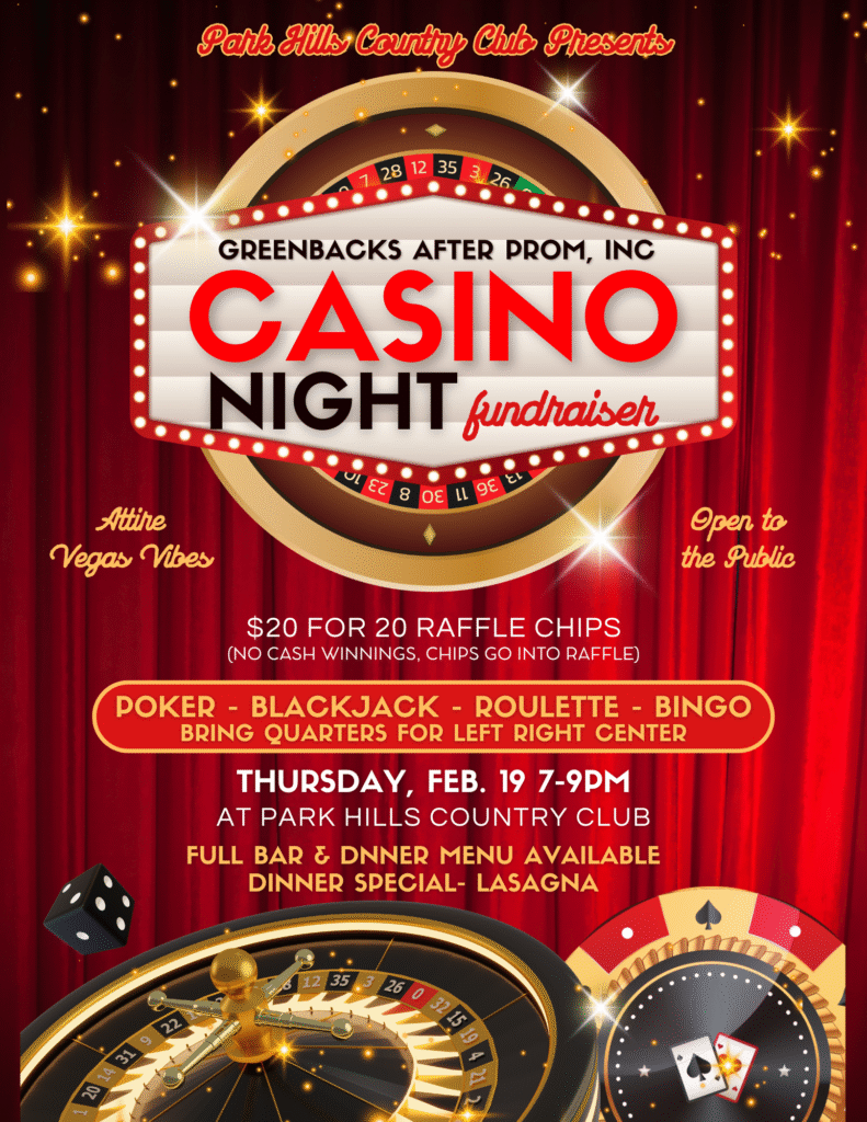 We’re hoping for a full house on February 19th. Greenbacks After Prom is hosting a casino night fundraiser. The suggested donation is $20 and it goes to a great cause! Don’t forget your lucky duds.