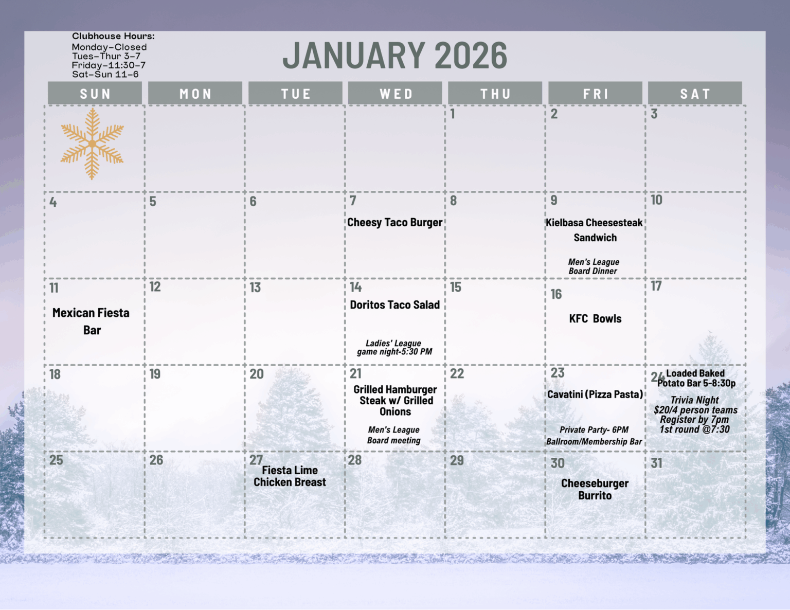 Happy New Year Park Hills!! December was wild and we’re taking a short break for some clubhouse TLC before we open the doors up to 2026. We’ll re-open January 6th, and there are quite a few opportunities to come dine with us!